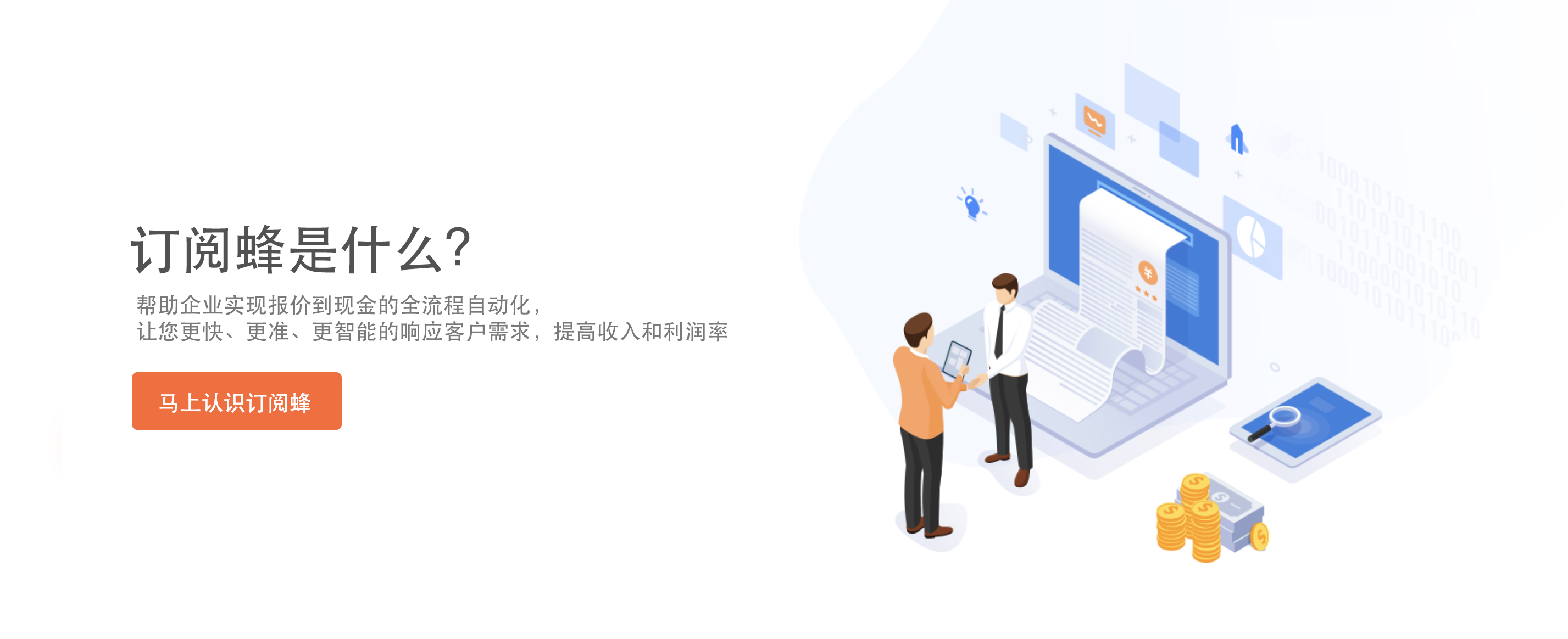 订阅蜂是专注于帮助企业实现从报价,订单,计费,支付,发票,到收入的全流程自动化,让您更快、更准、更智能的响应客户需求,提高收入和利润率,加速企业成长。点击观看更多信息: