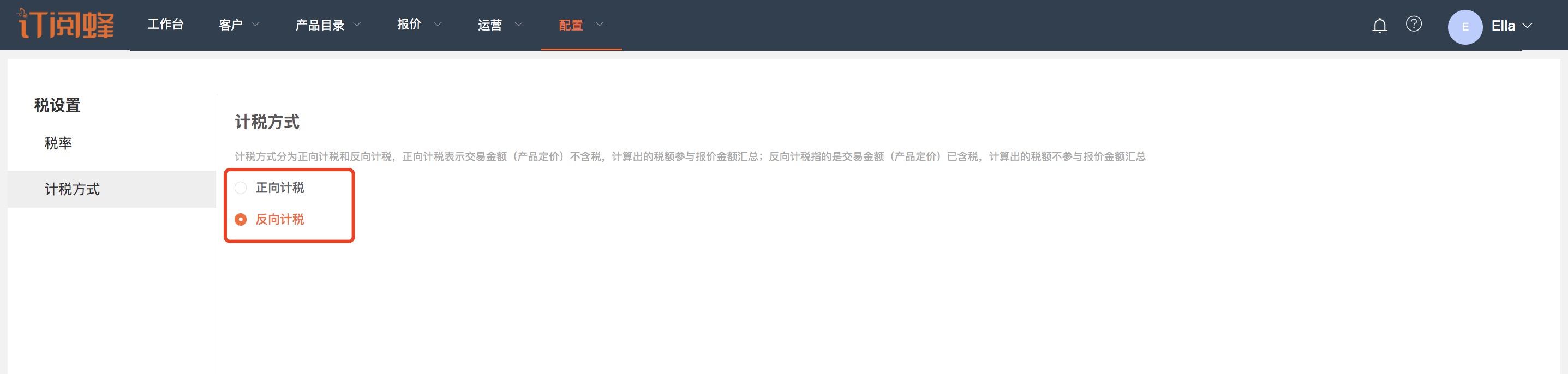 系统默认为“反向计税”,表示产品的价格为含税价。如果你的业务中产品价格是未含税价,请设置为“正向计税”