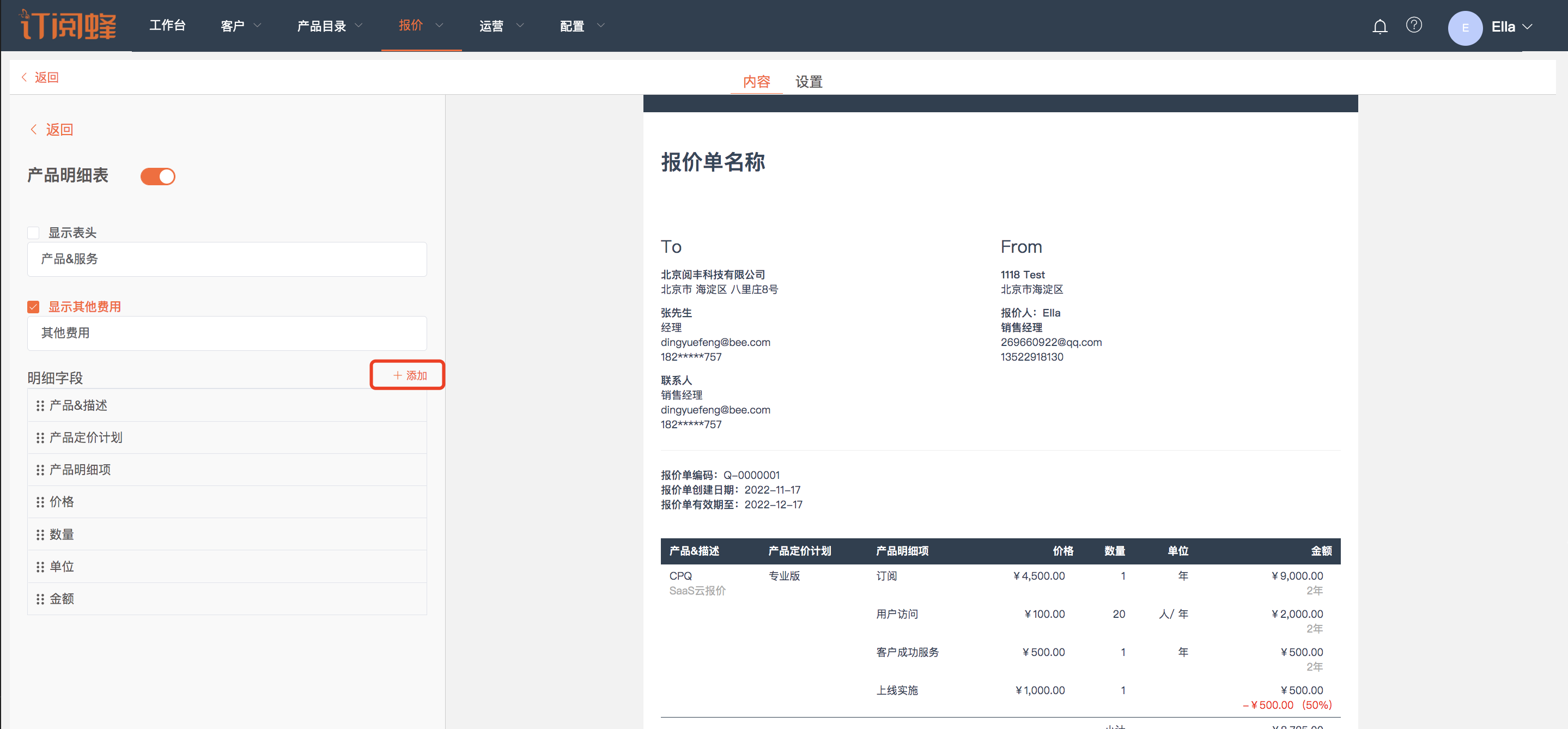 完成税的设置和报价单模版的设置之后,就可以为产品选择税率,报价时就会实时计算税额相关的信息。