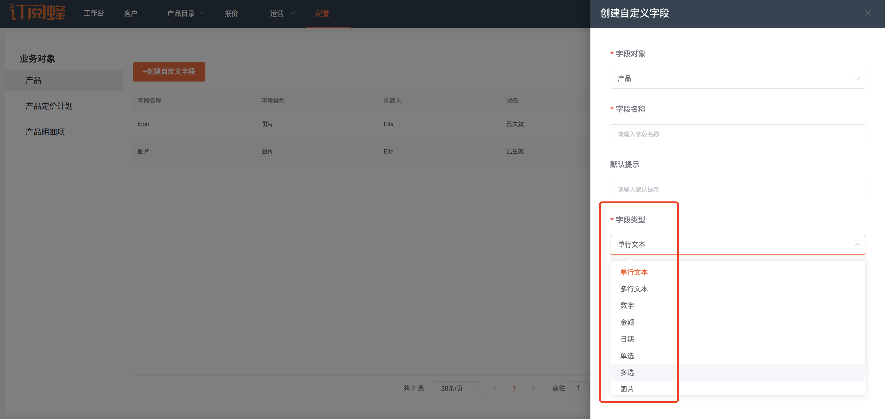 订阅蜂赋能企业定制化能力,支持在产品,产品定价计划和产品明细上添加自定义业务字段,报价单展示自定义字段。