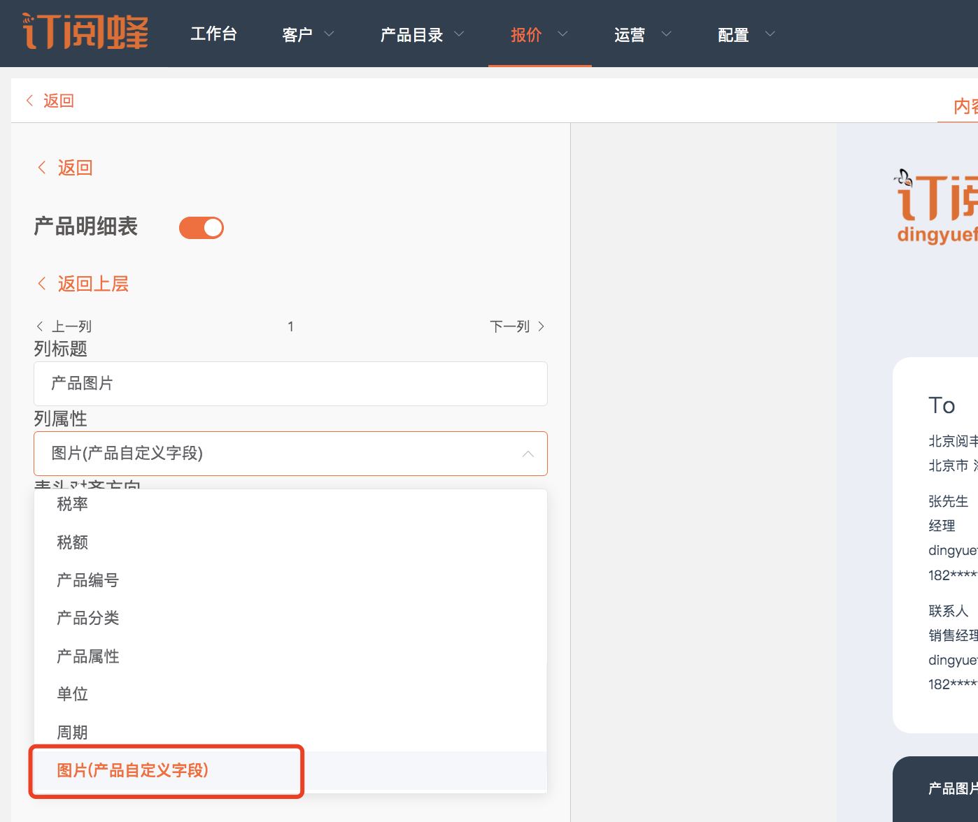 报价单可设置展示自定义字段