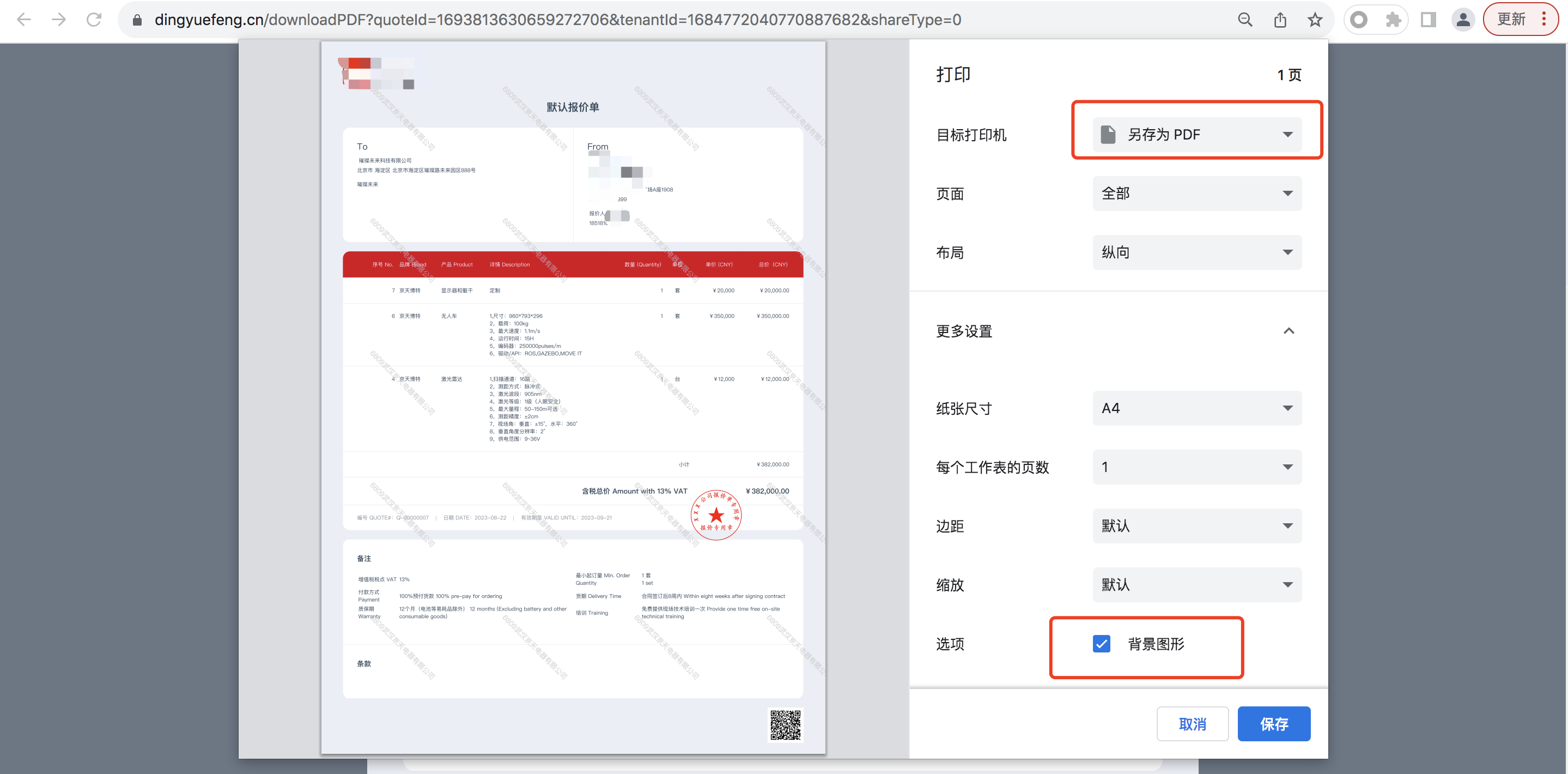 ⚠️ 选择“另存为PDF”, 勾选“背景图形”