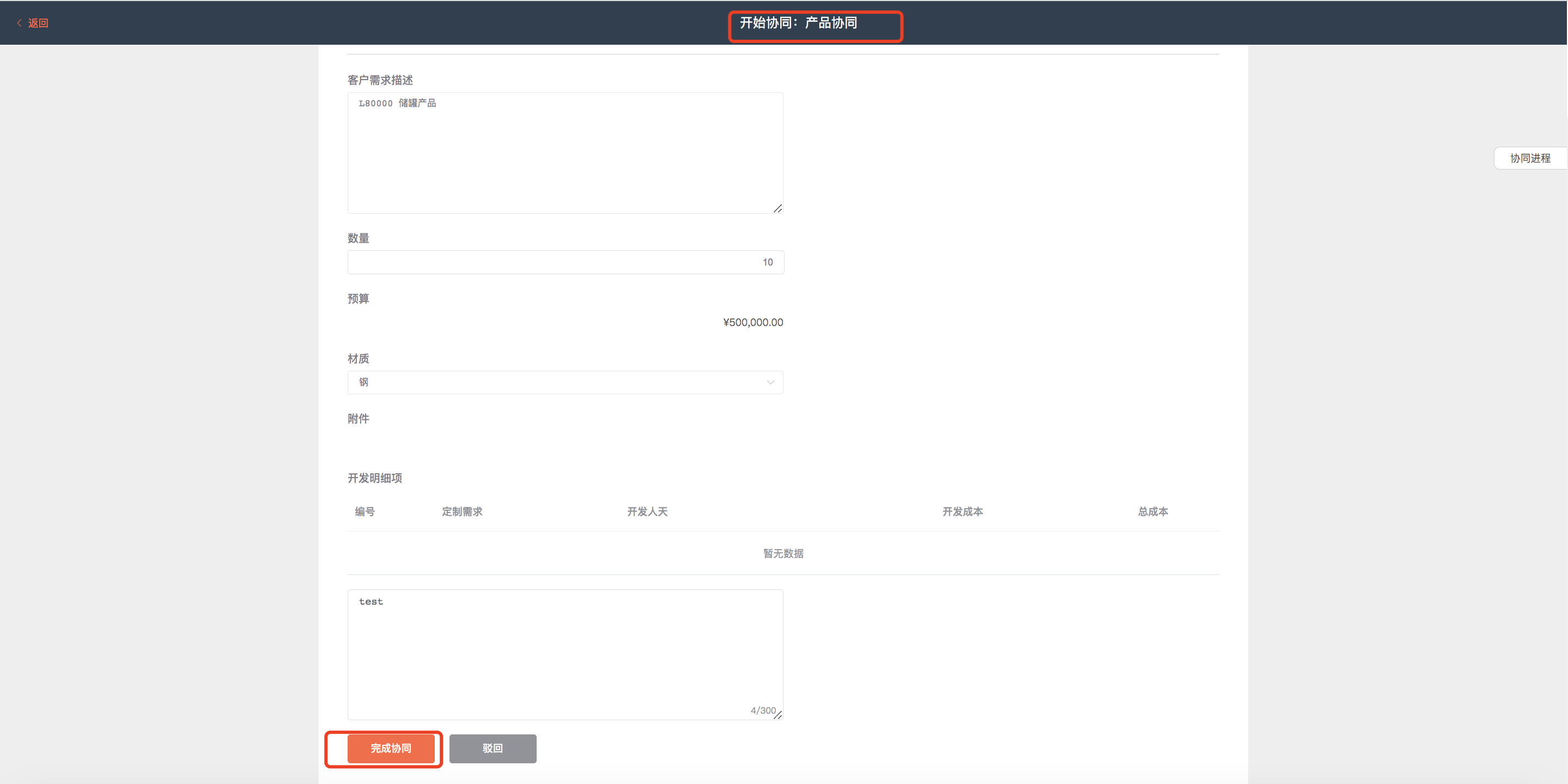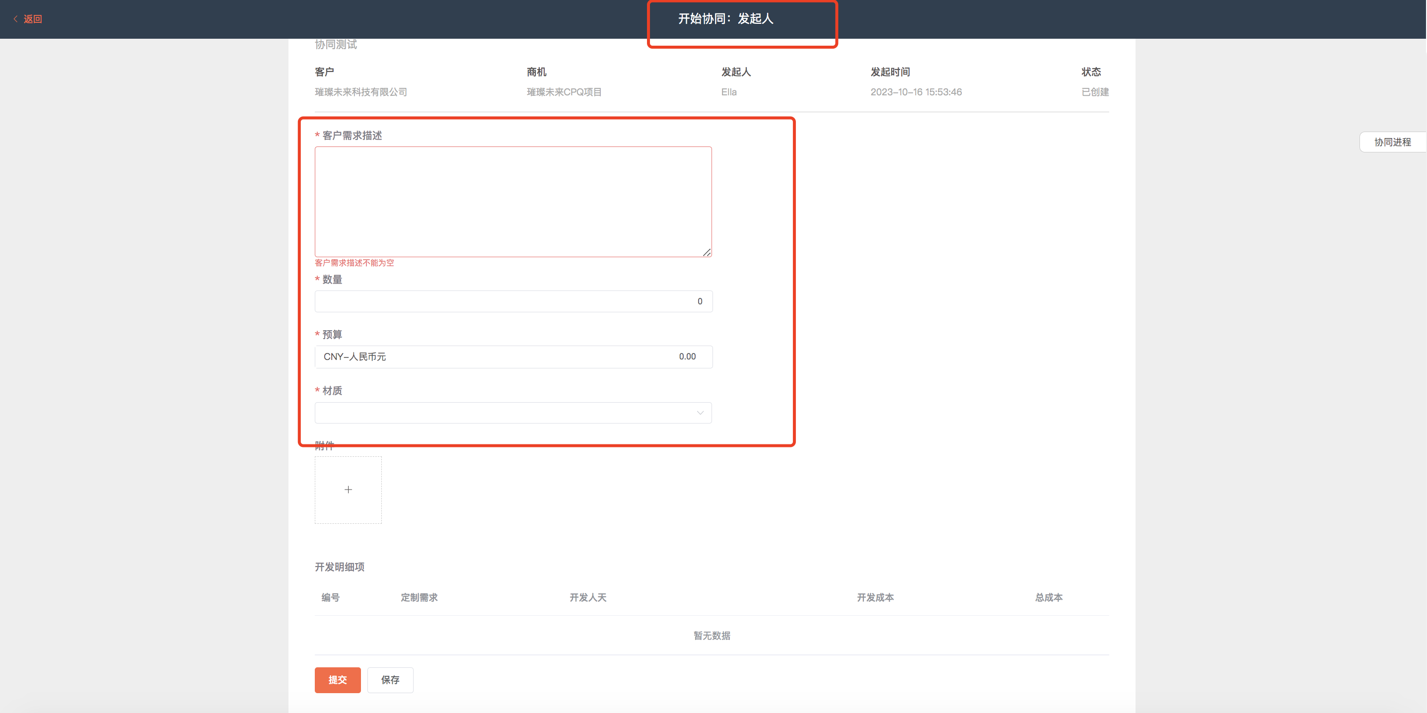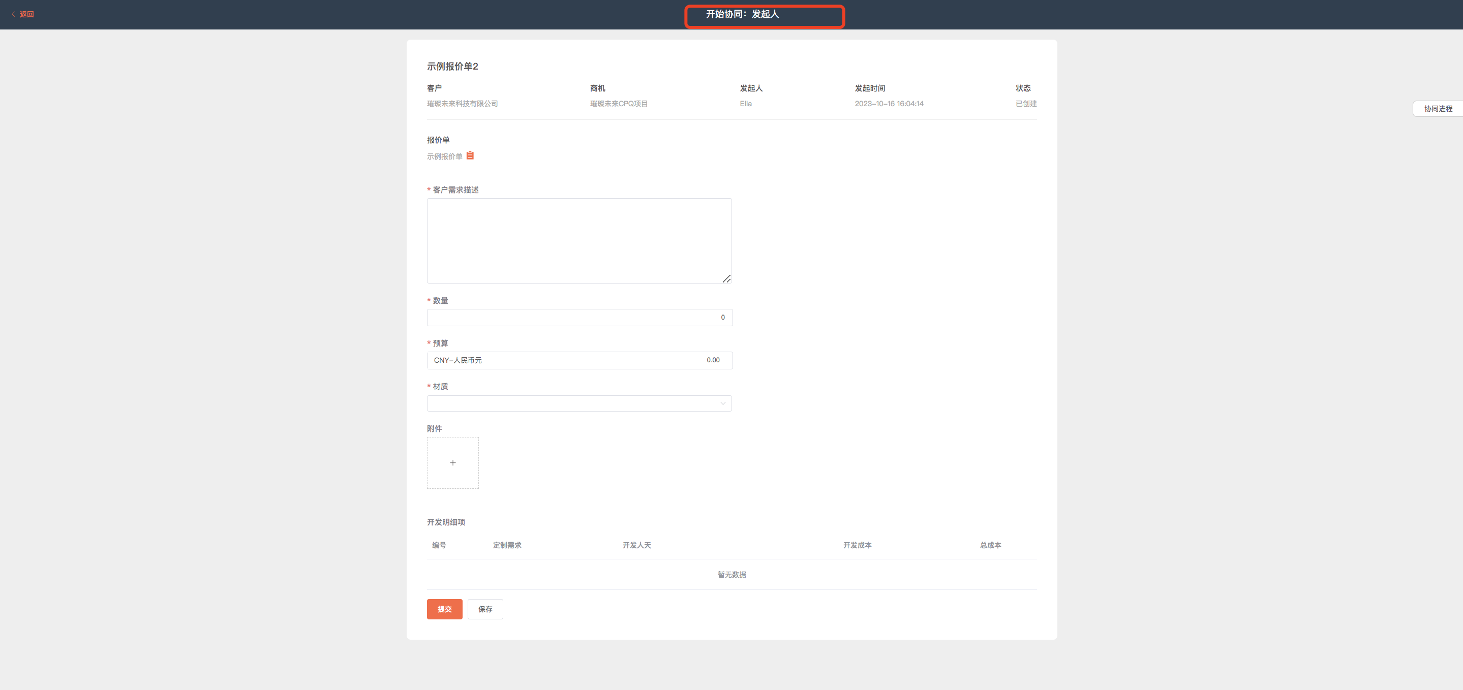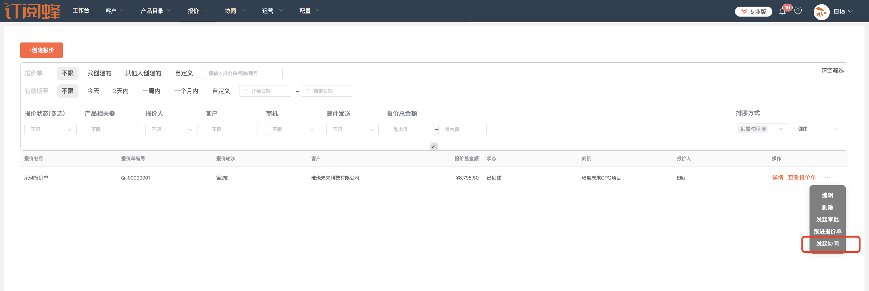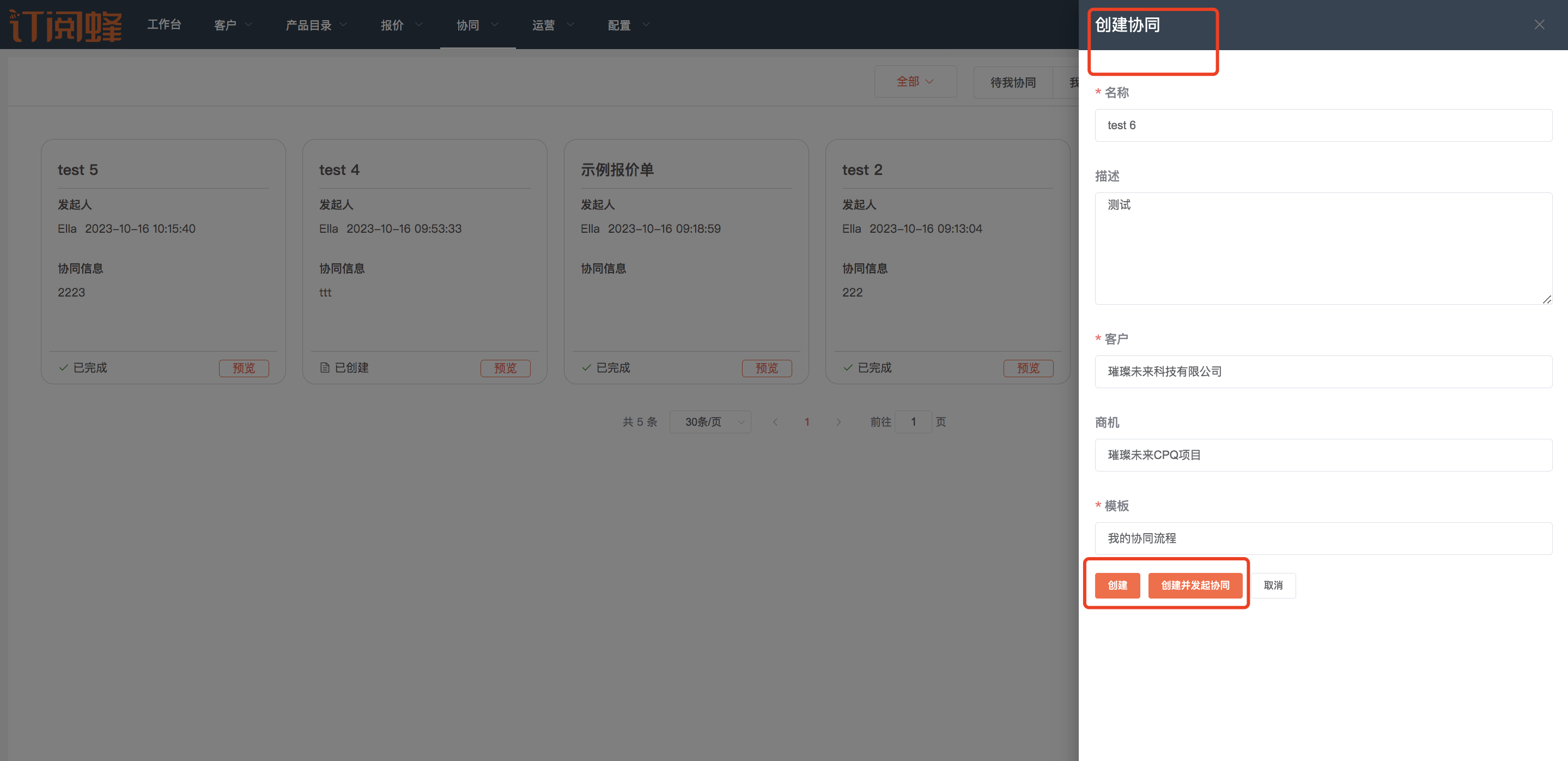 当报价单为已创建状态,可点击“发起协同”,系统后台将为当前报价单创建了协同,后续操作请参考“创建协同”和“开始协同”