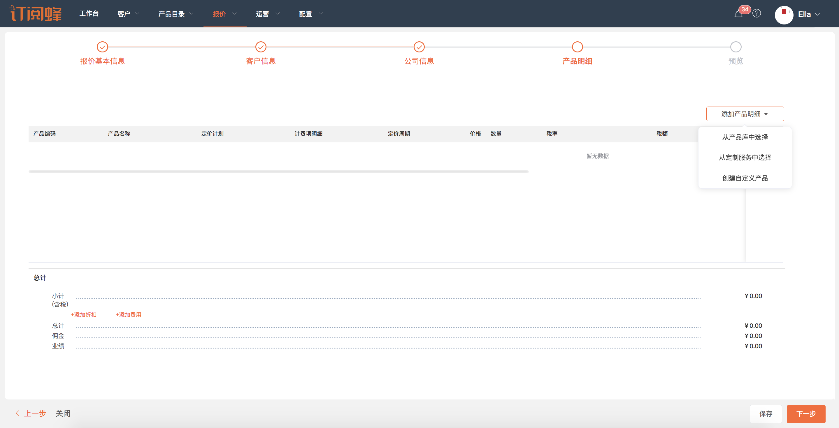 步骤四 产品明细设置; 产品选择有两种方式 从产品库中选择 、创建自定义产品