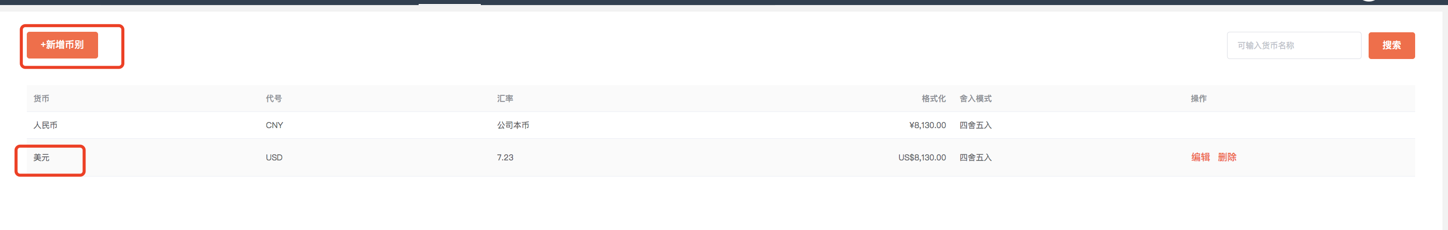 首先在币别管理中添加新的币别【导航:配置 -> 币别管理】