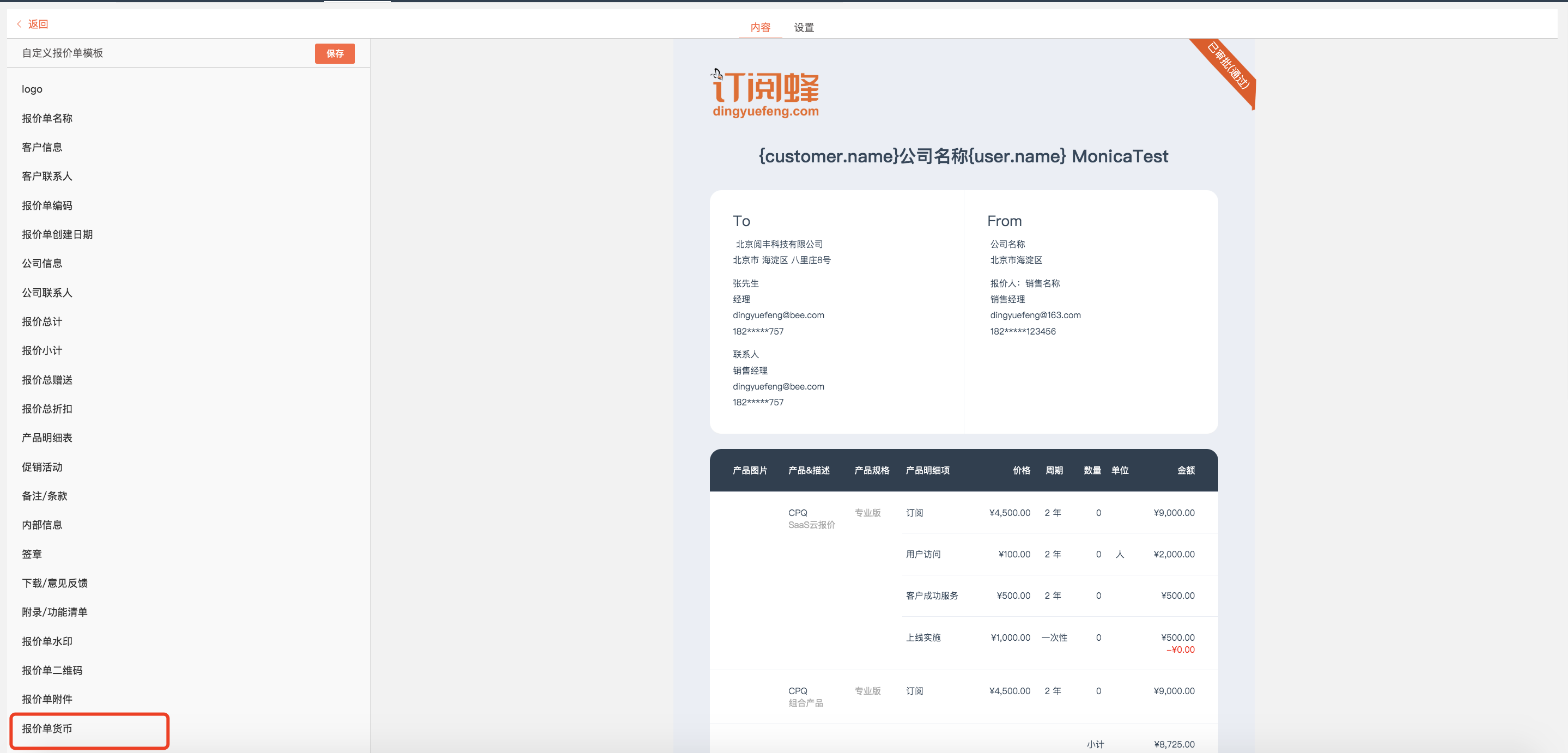 然后在报价单模版中启用报价币别【导航:报价 -> 报价单模版管理 -> 编辑模版】
